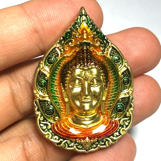 Pra Nakprok Ram Ruay Ngern Tong amulet from LP Tong of Wat Ban Rai in Nakorn Rachasima, first edition series amulets, with Buddha Face on front, and Yan Payanak on rear face, which encircle a Sacred Yant Duang, for lucky fortunes, promotion, lottery wins, promotion, protection against dangers and black magic, and improved Karma. Only 369 amulets Made in Nuea Fa Badtr Long Ya Rachawadee Khiaw Lueang Daeng Jiworn Som; Sacred Alsbowl Brass, with luxurious green yellow saffron colored Ya Rachawadee glazed colored enamels, GoldFace, and Brown hairs, with 3 code stamps on rear face.