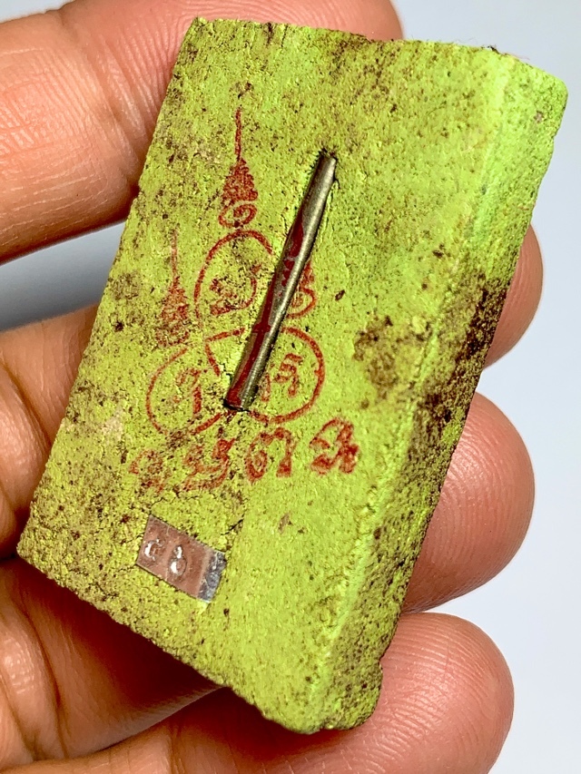 The amulets were made in the following colors; White, Black, Blue, Green, Dark Orange, Purple, Red, Yellow, and Gon Krok ('bottom of the mortar bowl' effect mixed colors). The 'standard' (nothing common or 'standard about this edition really!) models, are also inimitable and no two amulets exactly the same, some with Paeng Jerm sacred talc past from the hand of the monk to bless the amulets individually, or a piece of Civara Robe or Corpse cloth pasted onto the front face, etc. Standard models all have either the Yant Tri/Yant Maha Ud, or Yant Ongk Pra on the rear face, with a metallic code stamp, with some special ones having insertes in the rear face, as previously mentioned.