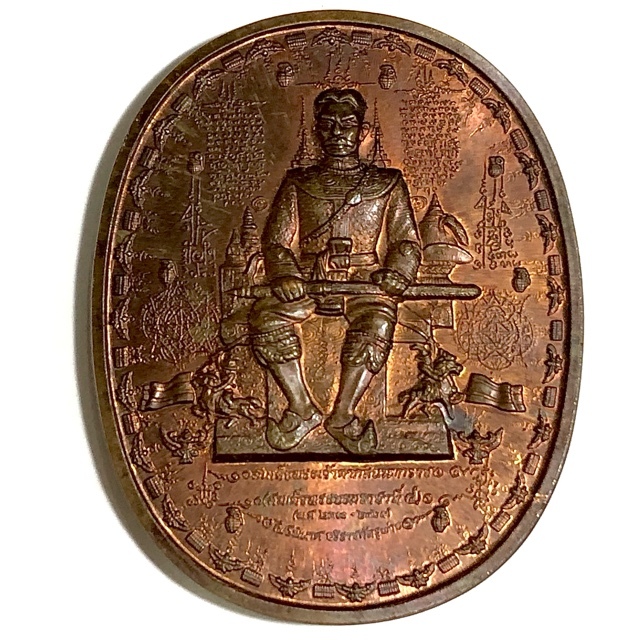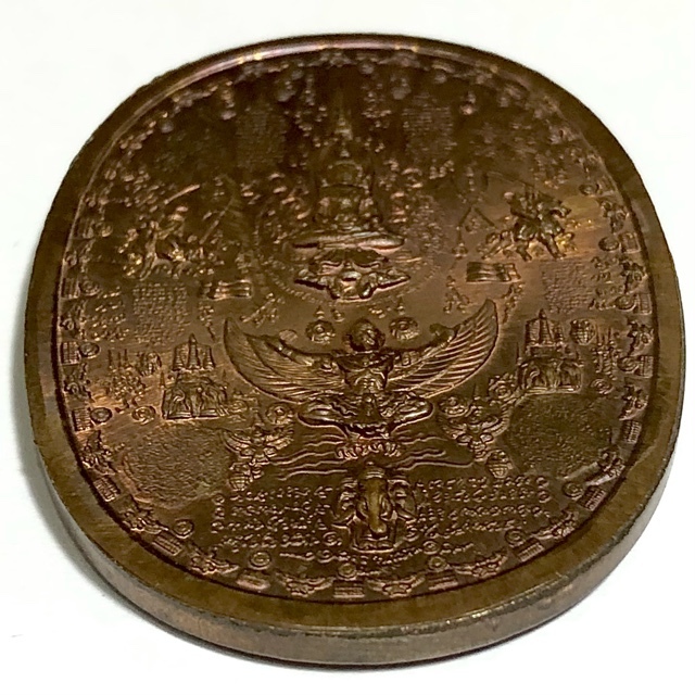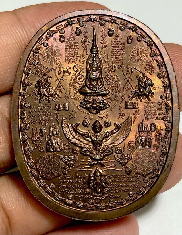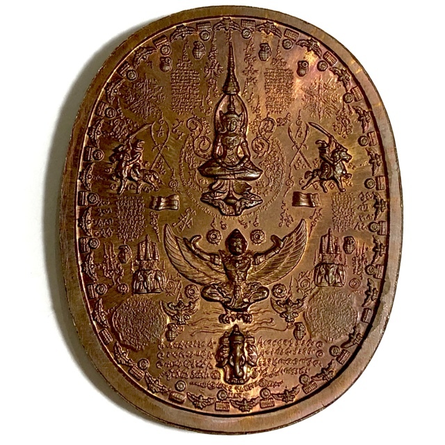The front face of the amulet features the image of Pra Jao Taksin Maharach seated upon his throne, holding a sword, A host of the Great Pantheon of Sacred Yantra, and 8 Bombs. The rear face features a mass of Sacred Yantra with Garudas, Images of Pra Jao Taksin Maharach on horseback riding into battle, the three headed Elephant Erawan, crowned with a Buddha seated in Royal Regalia.