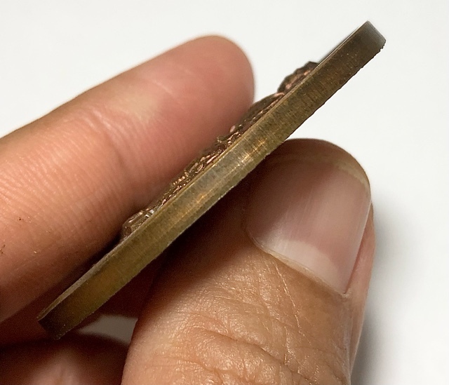 The Ceremony was performed on the 27th October of 2550 BE. and then given a subsequent Blessing in Bangkok at Wat Chana Songkram (the name of this temple means 'Temple of War Victory). The coins are large Pim Yai measuring 4.3 x 3.4 Cm in size, and weigh 30 grams.